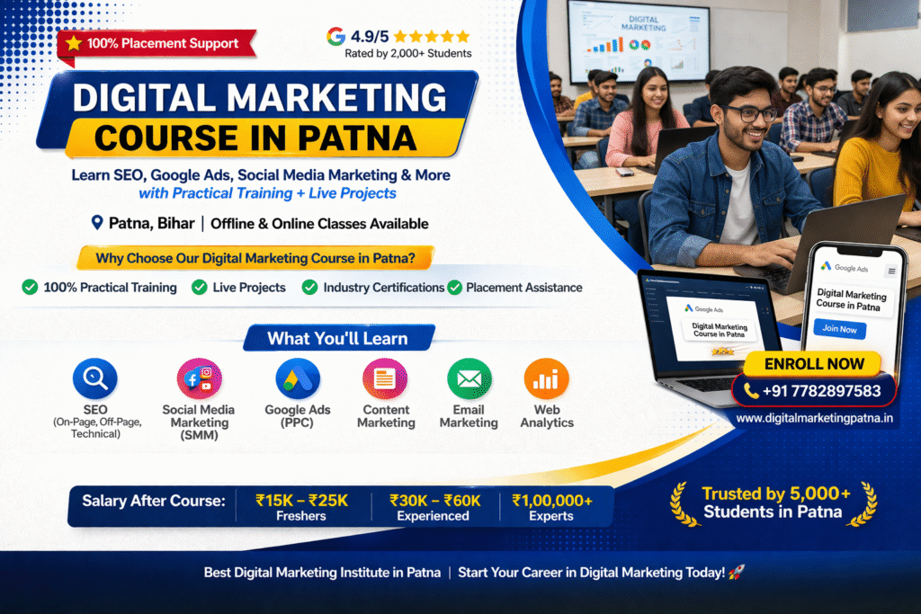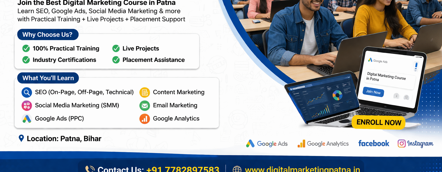 Digital marketing course in Patna is one of the best career options for students and professionals who want to build a future in online marketing.The best digital marketing course in Patna is a professional training program that teaches SEO, social media marketing, Google Ads, content marketing, and analytics with practical experience and placement support.